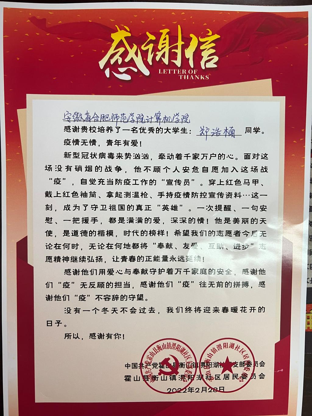 近日,betway收到六安市霍山县衡山镇淠阳湖社区发来的感谢信,高度赞扬betway2019级数据科学与大数据技术专业郑浩楠同学在寒假期间为淠阳湖社区疫情防控工作做出的积极贡献。