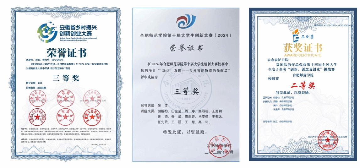 Ø 2024年9月,胡静怡团队的作品《“颂达”农递——乡村物流新赋能》,荣获2024年第三届安徽省乡村振兴创新创业大赛三等奖。