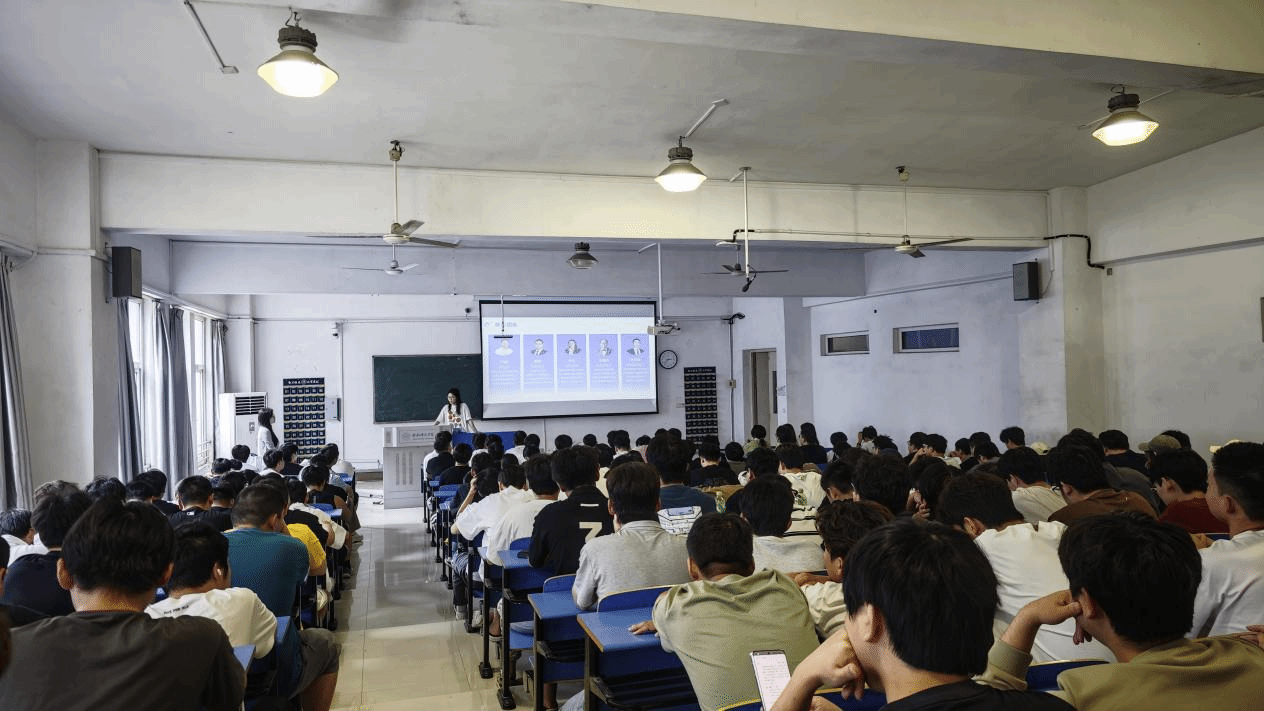 当天下午,实习生专场招聘会在逸夫楼A102教室顺利举行,吸引了2026届毕业班近200名学生参加,招聘会现场座无虚席。本次活动由汪中老师主持,梁瑞担任宣讲人。梁瑞详细介绍了公司的组织结构、企业环境、发展通道以及本次招聘的岗位需求。