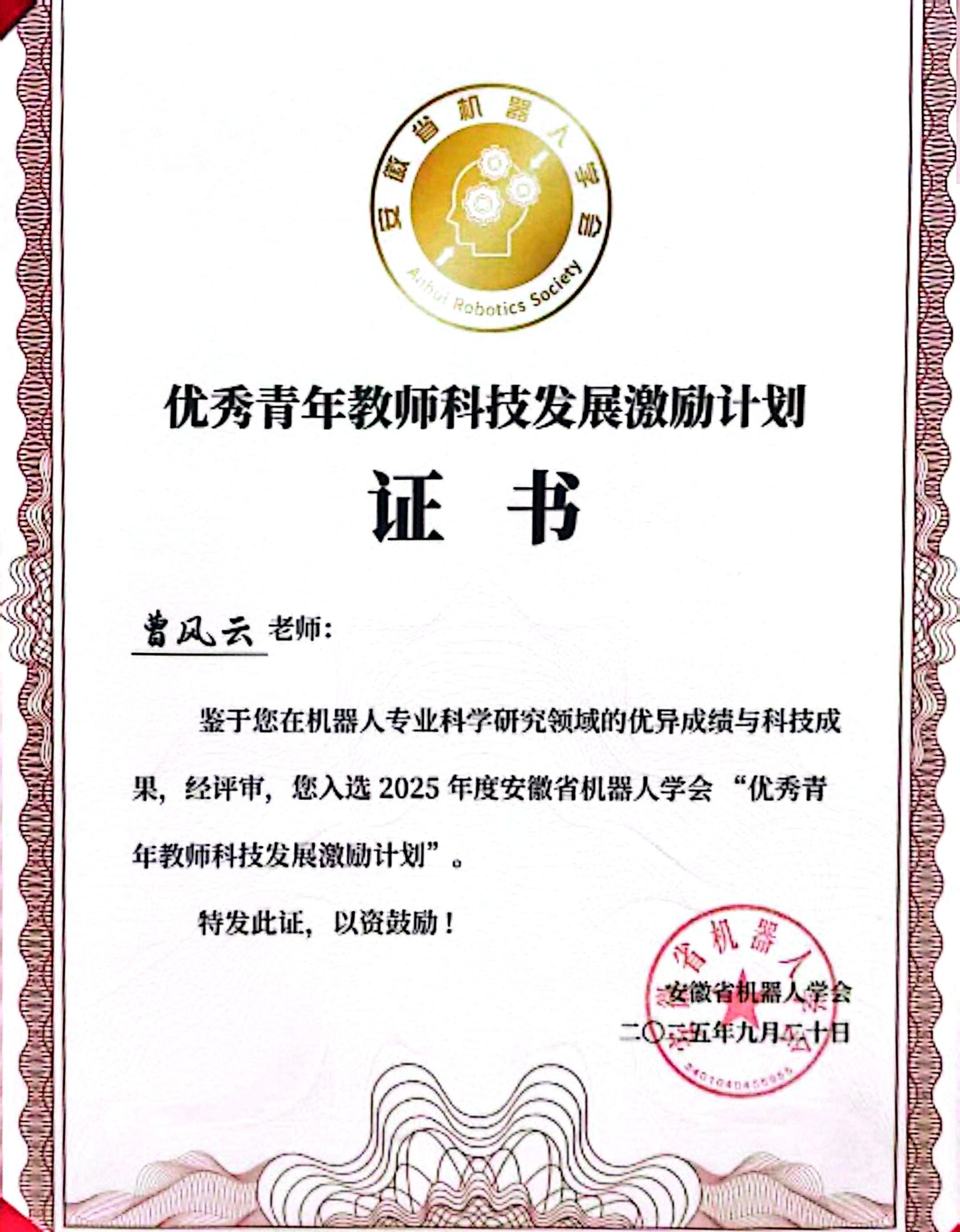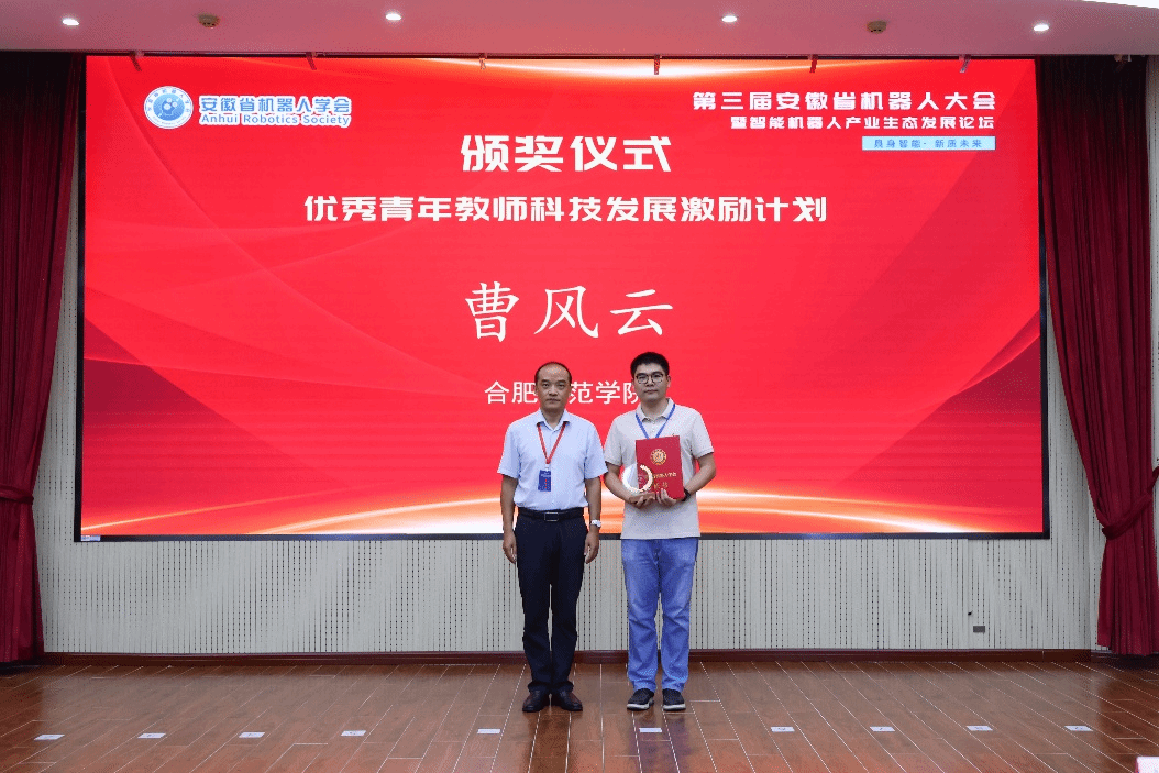 近日,第三届安徽省机器人大会暨智能机器人产业生态发展论坛在安徽工程大学召开,会上颁发了安徽省机器人学会2025年度奖励。betway西汉姆联官网曹风云老师荣获优秀青年教师发展激励计划奖励。