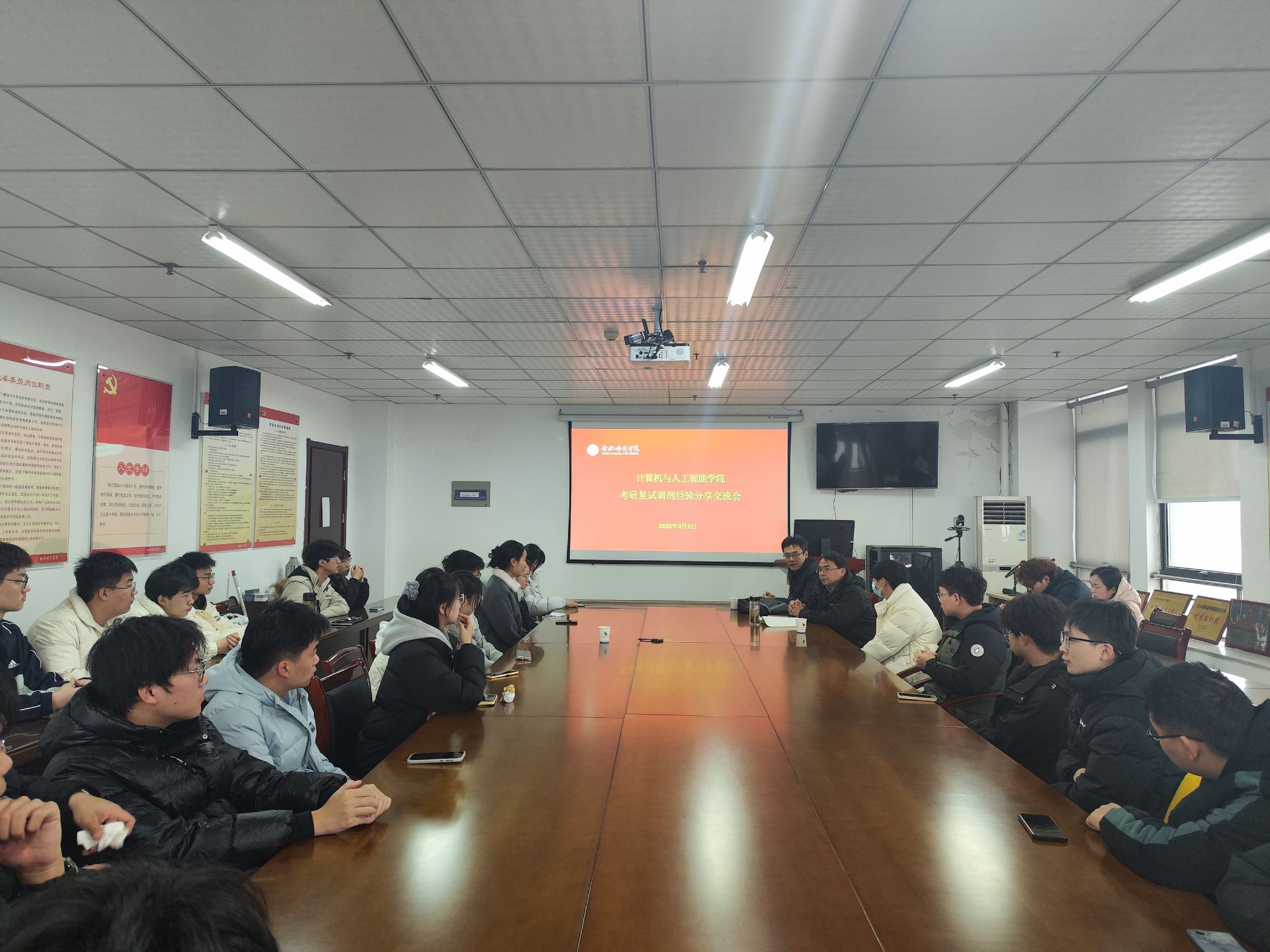 谢飞结合近几年的考研形势,分析了计算机相关专业考研的最新动向,提醒同学们要关注学科考研信息动态,合理规划复试进度,掌握复试技巧及调剂策略,合理选择调剂院校和专业。杨萍鼓励大家既要主动出击,又要精准匹配,学院会全力为同学们提供必要支持和帮助,整合各类资源,助力同学们顺利升学。苏喻对面试环节提出了针对性指导建议,提醒学生要认真梳理本科期间的学习、项目和竞赛经历,制作具有个人特色的学术简历,注重与导师沟通的技巧,展现个人学术潜力和专业素养。2023届软件工程毕业生郭挺硕士就读于安徽农业大学,他结合自身情况介绍了跨专业复试的准备流程和非全日制研究生在读体验。2024届物联网工程毕业生林学涛硕士就读于安徽大学,他围绕复试流程、面试技巧、简历制作、口语考试等方面进行了详细分享。2024届物联网工程毕业生李柔硕士就读于湖南科技大学,她主要介绍了调剂信息收集和心态调整方法,鼓励同学们坚定信心,积极准备,以最佳状态迎接复试挑战。