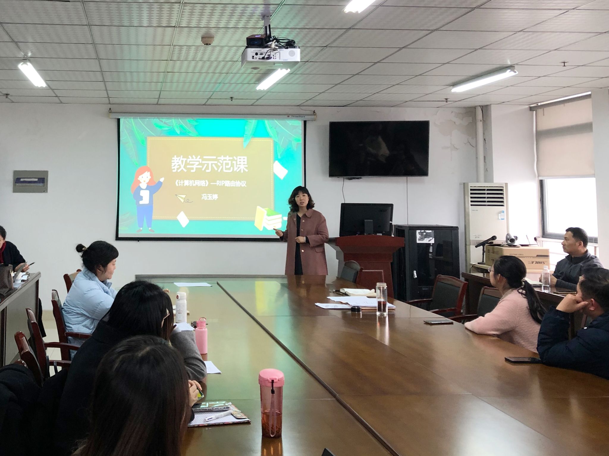 冯玉婷老师开展了《计算机网络》教学示范课。以《计算机网络》课程的RIP路由协议为例,通过教学示范课简要介绍了教学环节的五个重要组成部分。将锦绣校区的午餐路线问题引申为路由选择问题,将教学基本功大赛的教学思路融入教学示范课,为全院老师讲解了使用RIP协议建立路由表的过程。